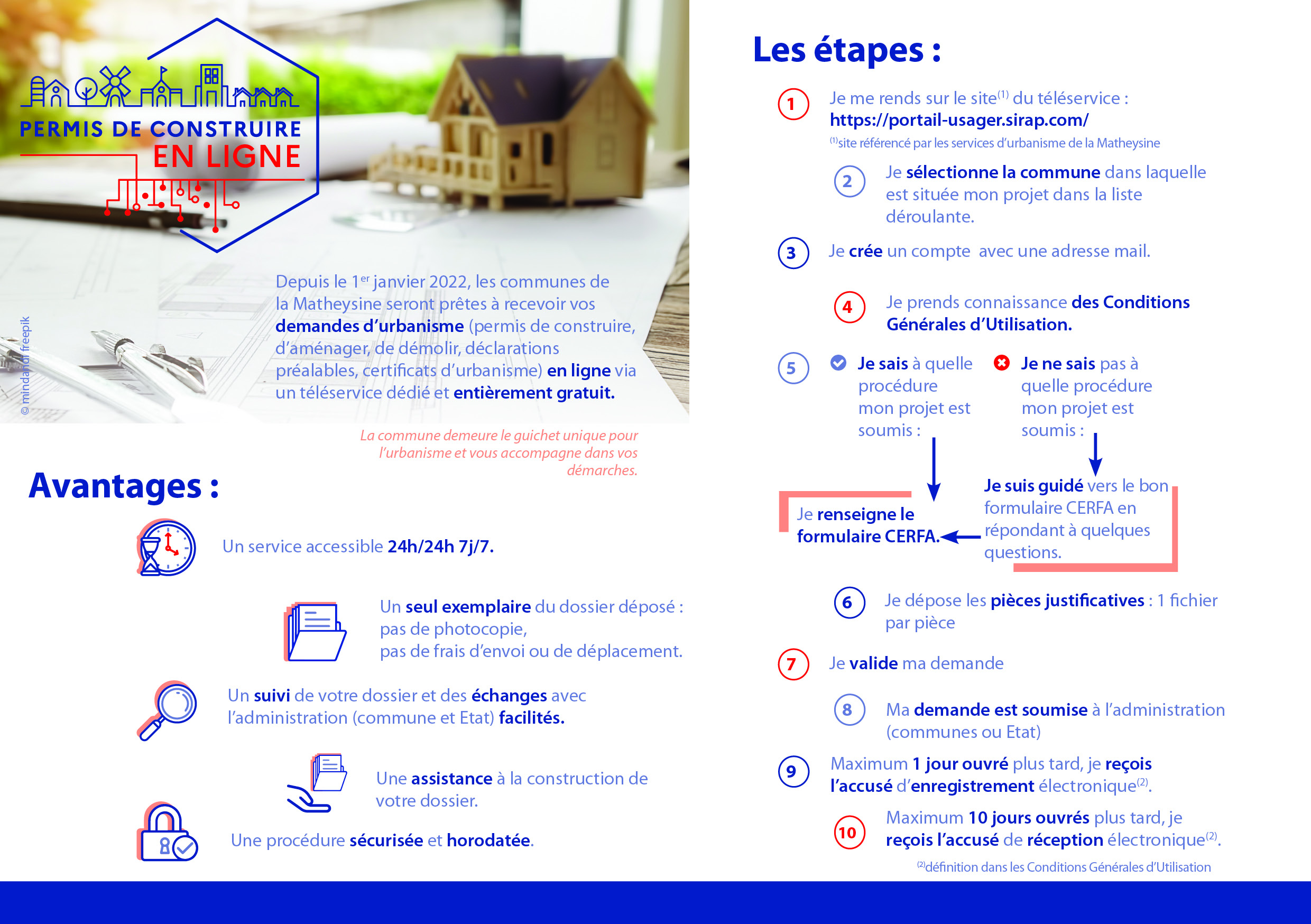 Dématérialisation de l'urbanismeDepuis le 1er janvier 2022, toute personne peut constituer sa demande d'urbanisme (Déclaration Préalable, Permis de construire, etc...) par voie dématérialisée. Zoom